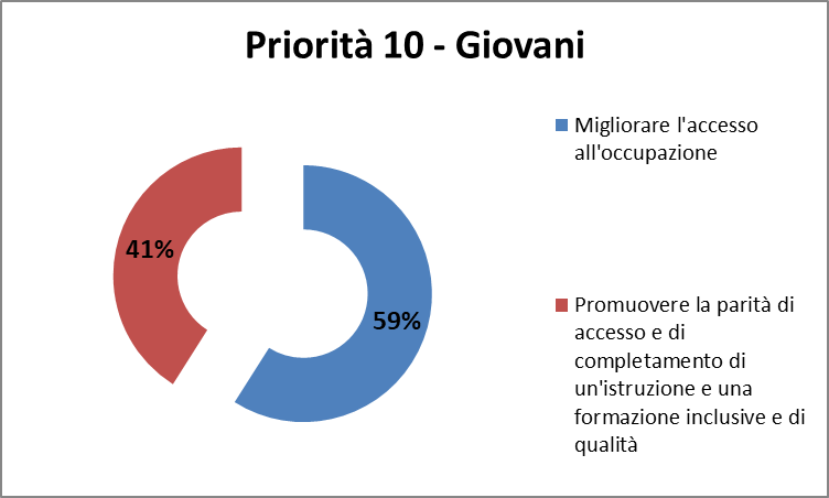 Guardiamo nel dettaglio i due obiettivi della Priorità 10, “Migliorare l’accesso all’occupazione e le misure di attivazione per tutte le persone in cerca di lavoro, in particolare i giovani, soprattutto attraverso l’attuazione della garanzia per i giovani, i disoccupati di lungo periodo e i gruppi svantaggiati nel mercato del lavoro, nonché delle persone inattive, anche mediante la promozione del lavoro autonomo e dell’economia sociale; (FSE+)” e “Promuovere la parità di accesso e di completamento di un’istruzione e una formazione inclusive e di qualità, in particolare per i gruppi svantaggiati, dall’educazione e cura della prima infanzia, attraverso l’istruzione e la formazione generale e professionale, fino al livello terziario e all’istruzione e all’apprendimento degli adulti, anche agevolando la mobilità ai fini dell’apprendimento per tutti e l’accessibilità per le persone con disabilità (FSE+)”. Entrambi gli obiettivi sono supportati dal Fondo Sociale Europeo.