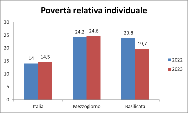In povertà relativa in Basilicata ci sono 105.903 gli individui in povertà relativa. Il dato è migliore della percentuale rilevata per il Mezzogiorno e migliore rispetto al 2022.